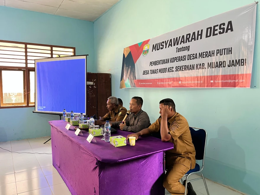 Pemerintah Desa Tunas Mudo mengadakan Musyawarah Desa (Musdes) terkait pembentukan Koperasi Desa Merah Putih di ruang Pertemuan Desa Tunas Mudo, Kecamatan Sekernan, Kabupaten Muaro Jambi. Kegiatan ini merupakan langkah strategis pemerintah desa dalam memperkuat perekonomian masyarakat dan meningkatkan kesejahteraan warga desa.